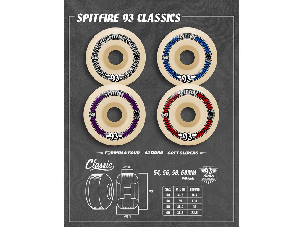 Firma Spitfire Wheels je opravdovej fenomén. Její logo zná naprosto každej a v týmu najdeme jména jako Reynolds, Song, Wair nebo třeba Taylor. V nabídce máme i tenhle model klasickýho tvaru ve velikosti 60 mm. Kolečka jsou z vychytanýho materiálu Formula Four, kterej je mega rychlej a odolnej proti plošinkám. Jedná se zatím o nejlepší kola v historii týhle značky. Tvrdost 93DU je ideální na rozpraskanej beton, asfalt a o něco víc dirty spoty. Uvedená cena je za celou sadu 4 koleček.