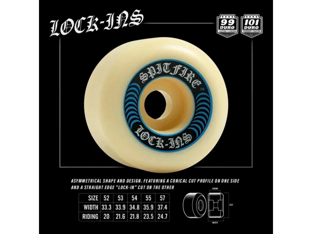 Firma Spitfire Wheels je opravdovej fenomén. Její logo zná naprosto každej a v týmu najdeme jména jako Reynolds, Song, Wair nebo třeba Taylor. V nabídce máme tenhle týmovej model ve velikosti 53 mm z vychytanýho materiálu Formula Four, kterej je mega rychlej a odolnej proti plošinkám. Jedná se zatím o nejlepší kola v historii týhle značky. Shape Lock-In má z jedný strany oblíbenej kónickej tvar a z druhý strany je kolečko plochý pro lepší zaseknutí o koping nebo rail a bednu.