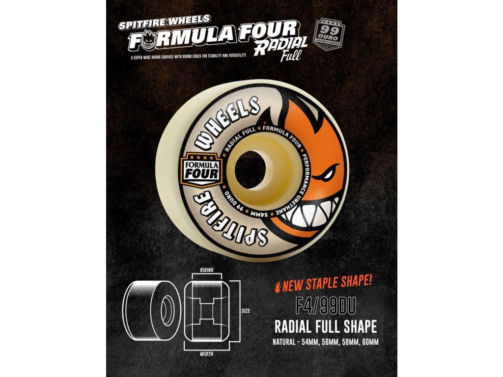 Firma Spitfire Wheels je opravdovej fenomén. Její logo zná naprosto každej a v týmu najdeme jména jako Reynolds, Song, Wair nebo třeba Taylor. V nabídce máme i tenhle model ve tvaru Radial Full z vychytanýho materiálu Formula Four, kterej je mega rychlej a odolnej proti plošinkám. Jedná se zatím o nejlepší kola v historii týhle značky. Uvedená cena je za celou sadu 4 koleček.