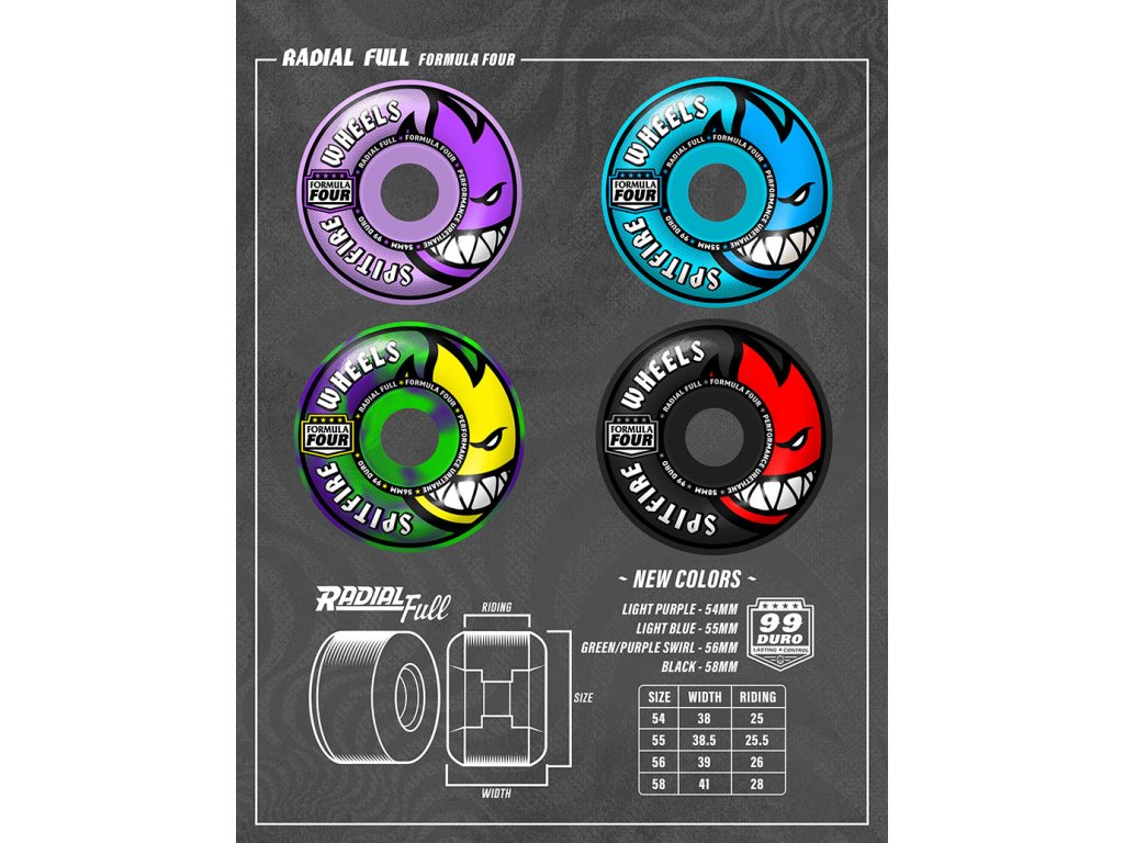 Firma Spitfire Wheels je opravdovej fenomén. Její logo zná naprosto každej a v týmu najdeme jména jako Reynolds, Song, Wair nebo třeba Taylor. V nabídce máme i tenhle model ve velikosti 58 mm a tvrdosti 99 z vychytanýho materiálu Formula Four, kterej je mega rychlej a odolnej proti plošinkám. Jedná se zatím o nejlepší kola v historii týhle značky. Uvedená cena je za celou sadu 4 koleček.