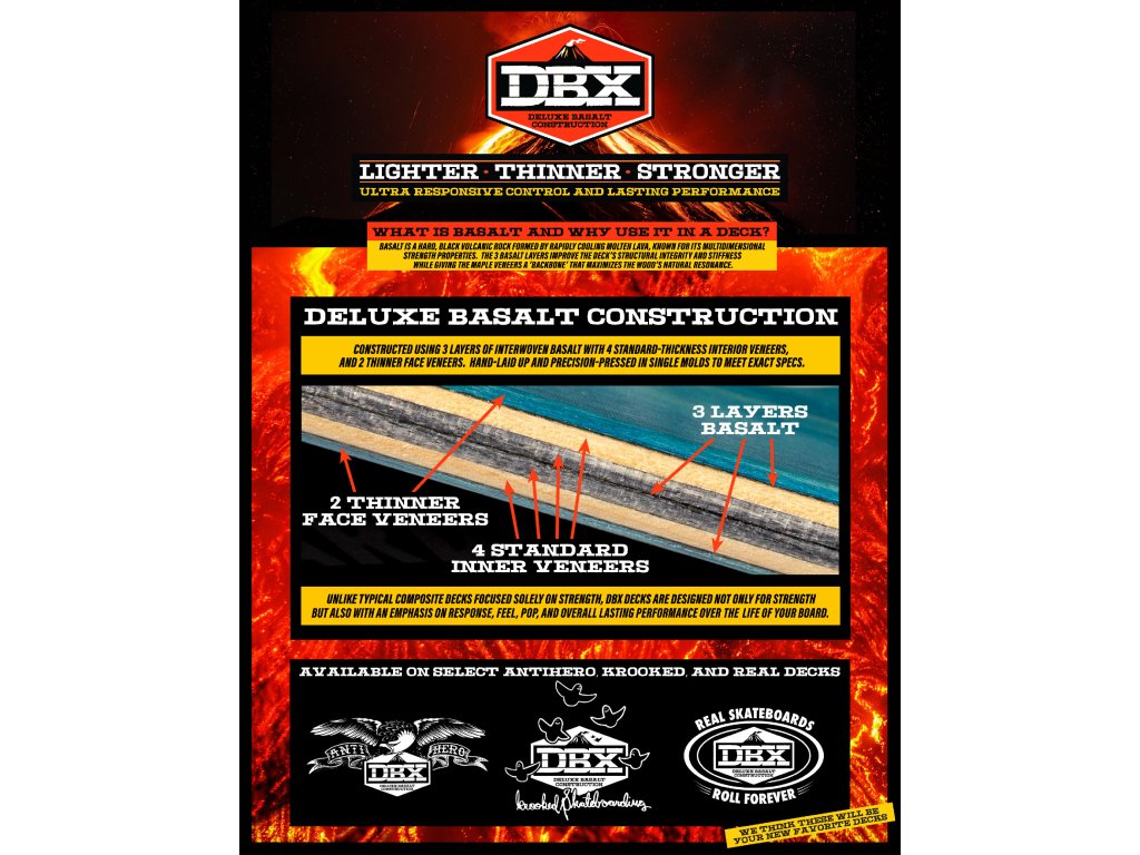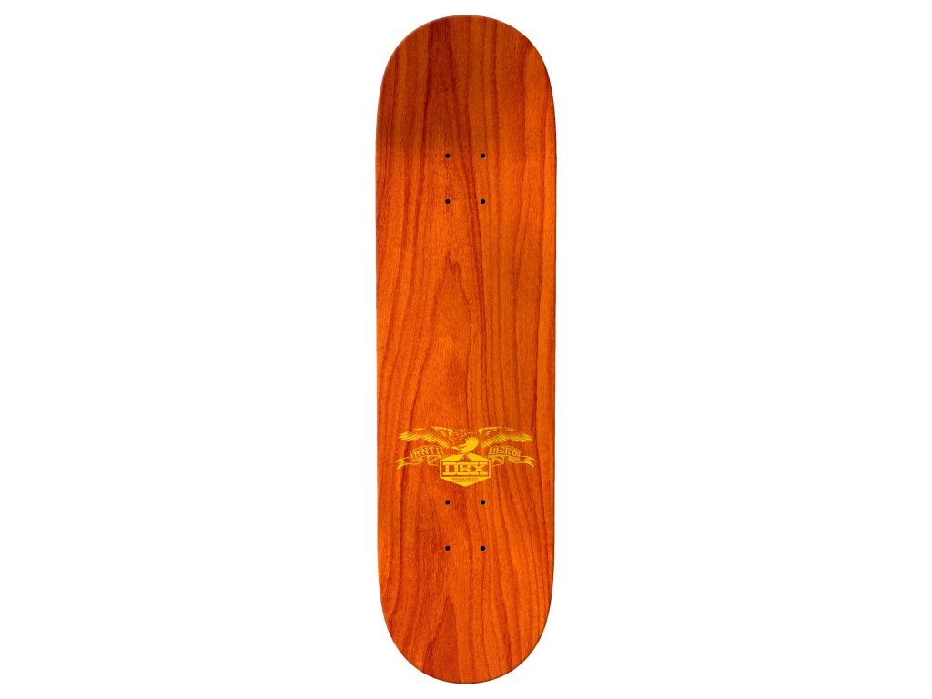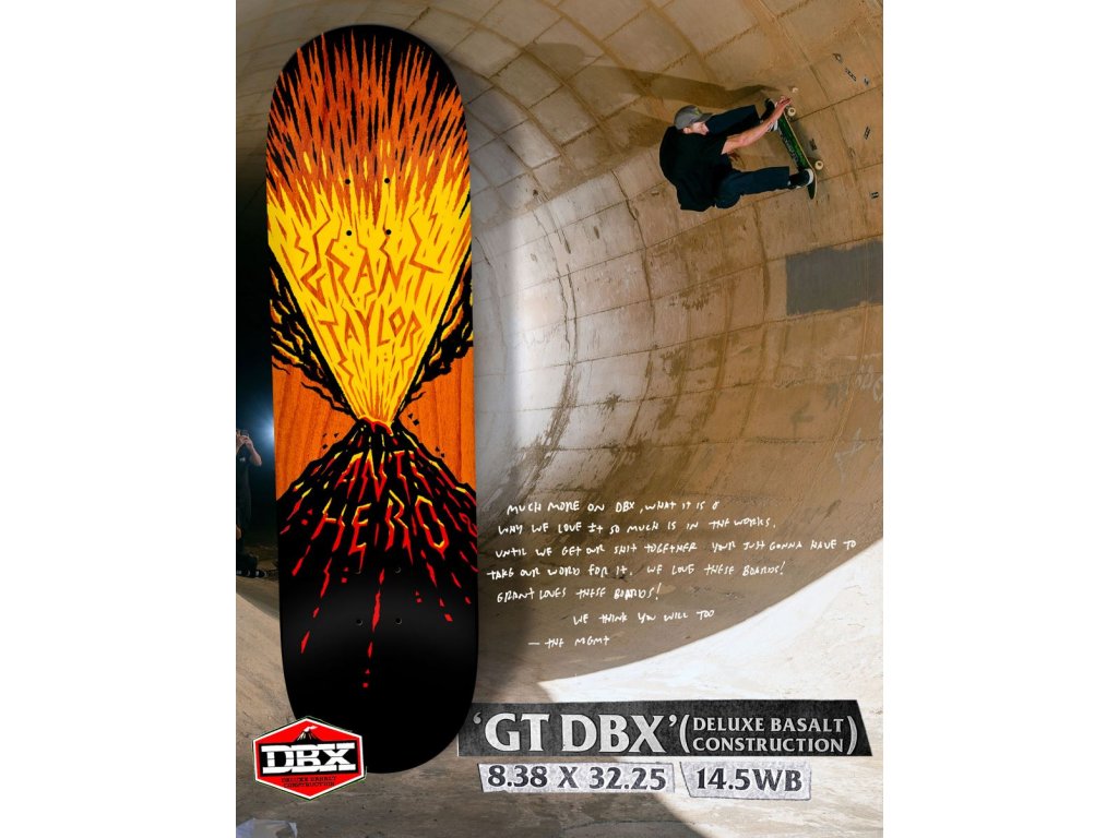 Firma Antihero skateboards, součást DLX SF distribution, je opravdovou legendou, a to hlavně mezi riderema, co nedaj dopustit na bazénový ježdění. V týmu najdete takový jména jako je Tony Trujillo, Grant Taylor nebo třeba Chris Pfanner. V nabídce máme i tuhle speciální desku s technologií DBX. Díky použití tří vrstev čediče je lehčí, užší a pevnější než klasika. Pro více informací si přočtěte přiložený materiály v produktovejch fotkách. Grip zdarma je samozřejmostí.
